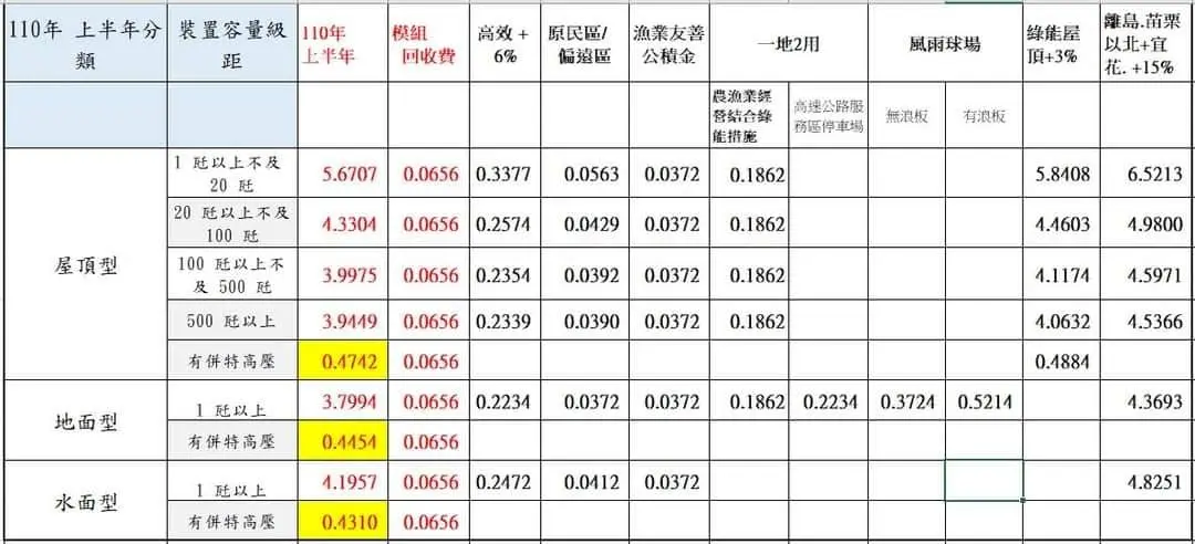 民國110年,西元2021年太陽能費率 2021年上半年太陽能費率 2021年下半年太陽能費率